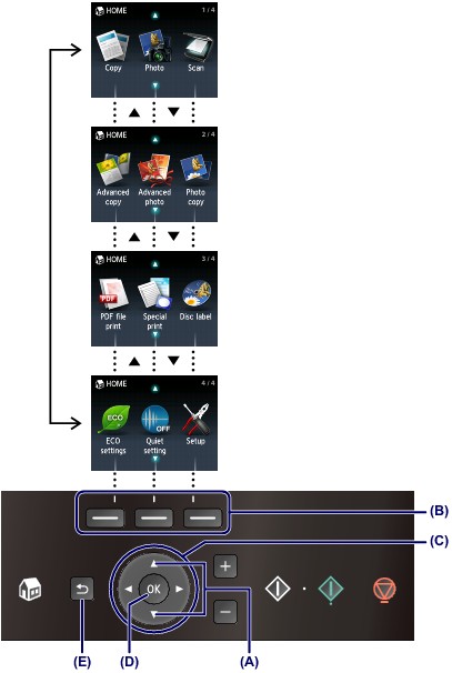 button (A) to switch between them. Each screen provides menus for making copies, printing photos, scanning originals, etc.