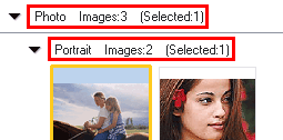 Displays categories containing images, along with the contained images. More images will be displayed in the Thumbnail window, allowing you to find or move images easily.
