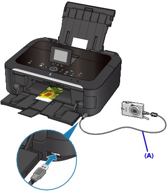Connect the PictBridge compliant device to the machine using a USB cable (A) recommended by the device's manufacturer.