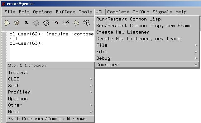 There are a number of Emacs menus associated with Allegro CL that are submenus of the ACL menu, including File, Edit, Debug, and Composer. When Allegro Composer is started, the ACL/Composer Menu items become available. (More precisely, before Allegro Composer is started, only the Start Composer item is available. After Allegro Composer is started, that item becomes unavailable, and the remaining items become available.
